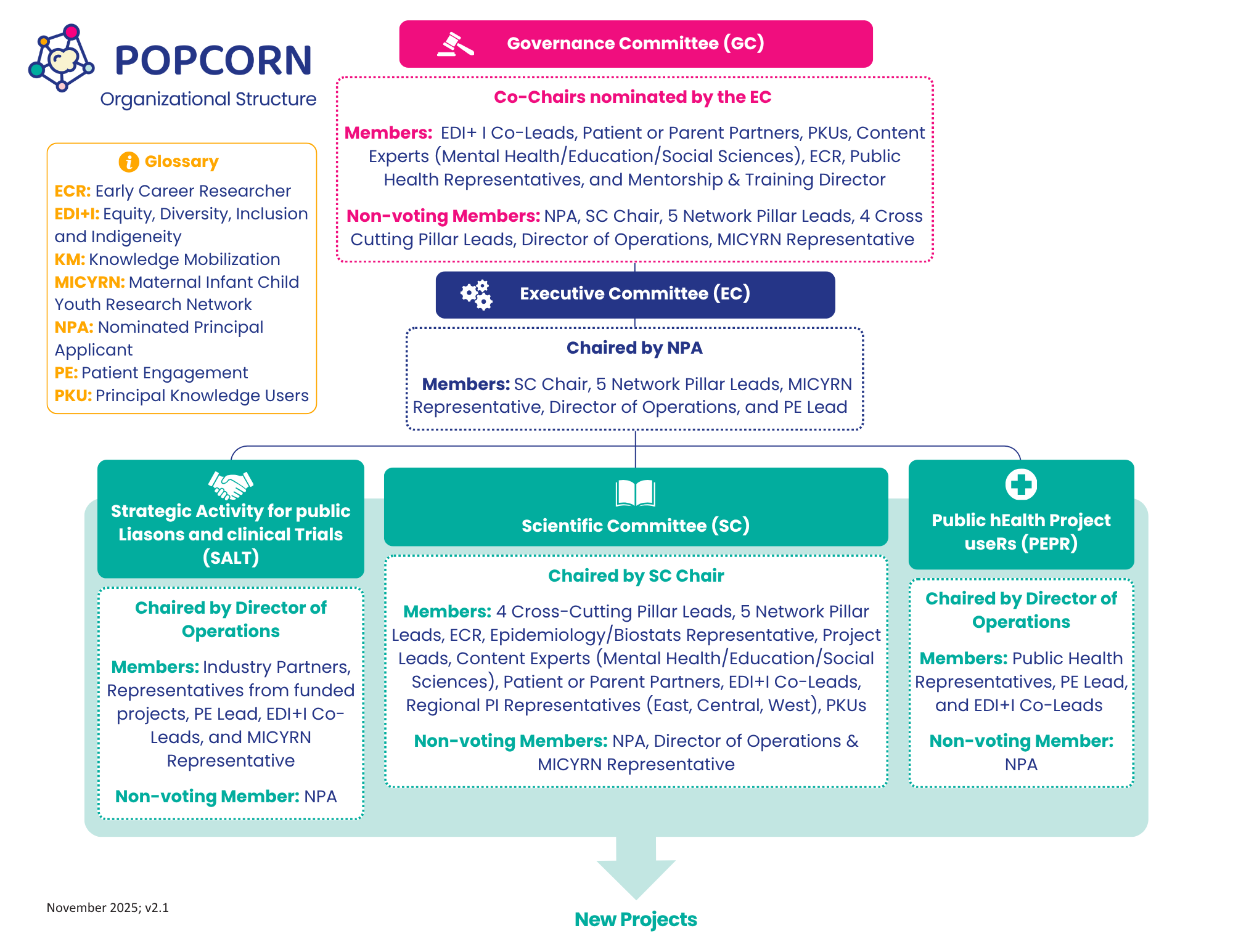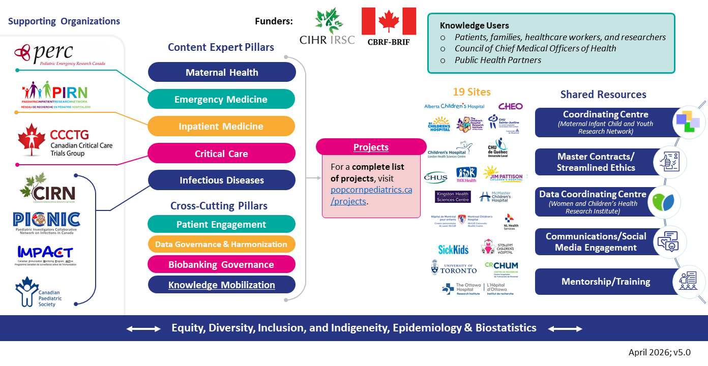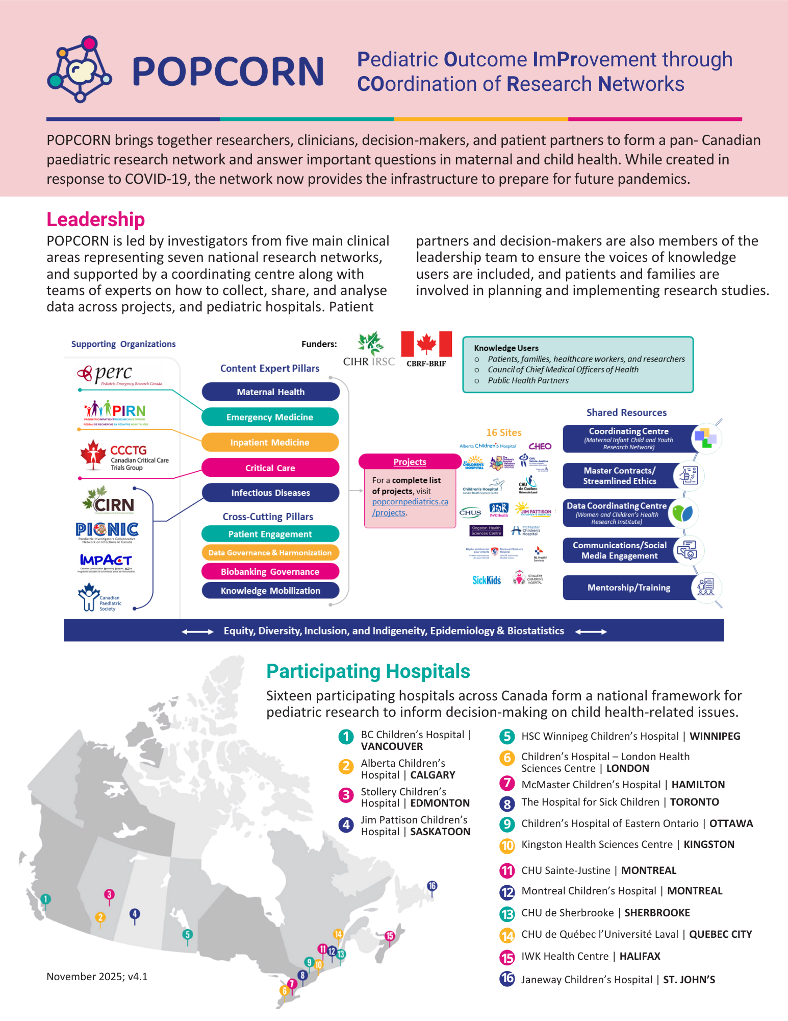 Our infographics offer a visual overview of the POPCORN network, highlighting our supporting organizations, content expert and cross-cutting pillars, and shared resources with our Equity, Diversity, Inclusion & Indigeneity, and Epidemiology & Biostatistics woven throughout our network.